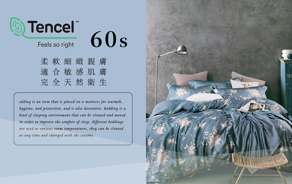 Tencel天絲™萊賽爾纖維製成的 100%60支 【幽香如夢-藍】 鋪棉床包舖棉兩用被四件式組-60aa