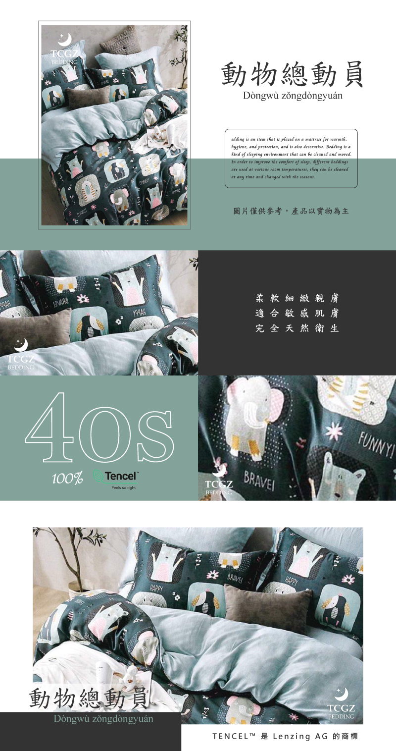 Tencel天絲™萊賽爾纖維製成的 100%40支 【動物總動員】 薄床包舖棉兩用被四件式組