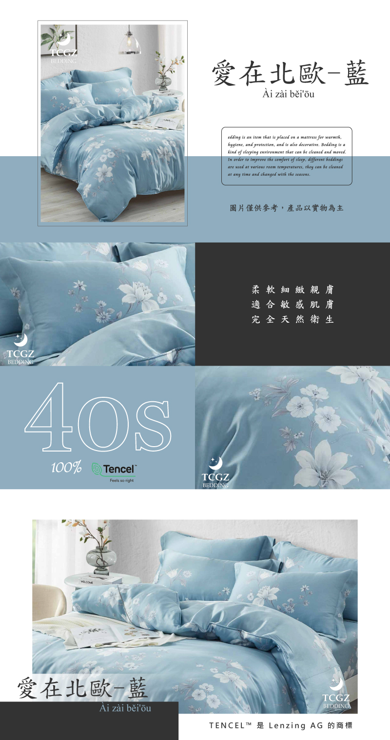 Tencel天絲™萊賽爾纖維製成的 100%40支 【愛在北歐-藍】 舖棉床罩舖棉兩用被七件式組
