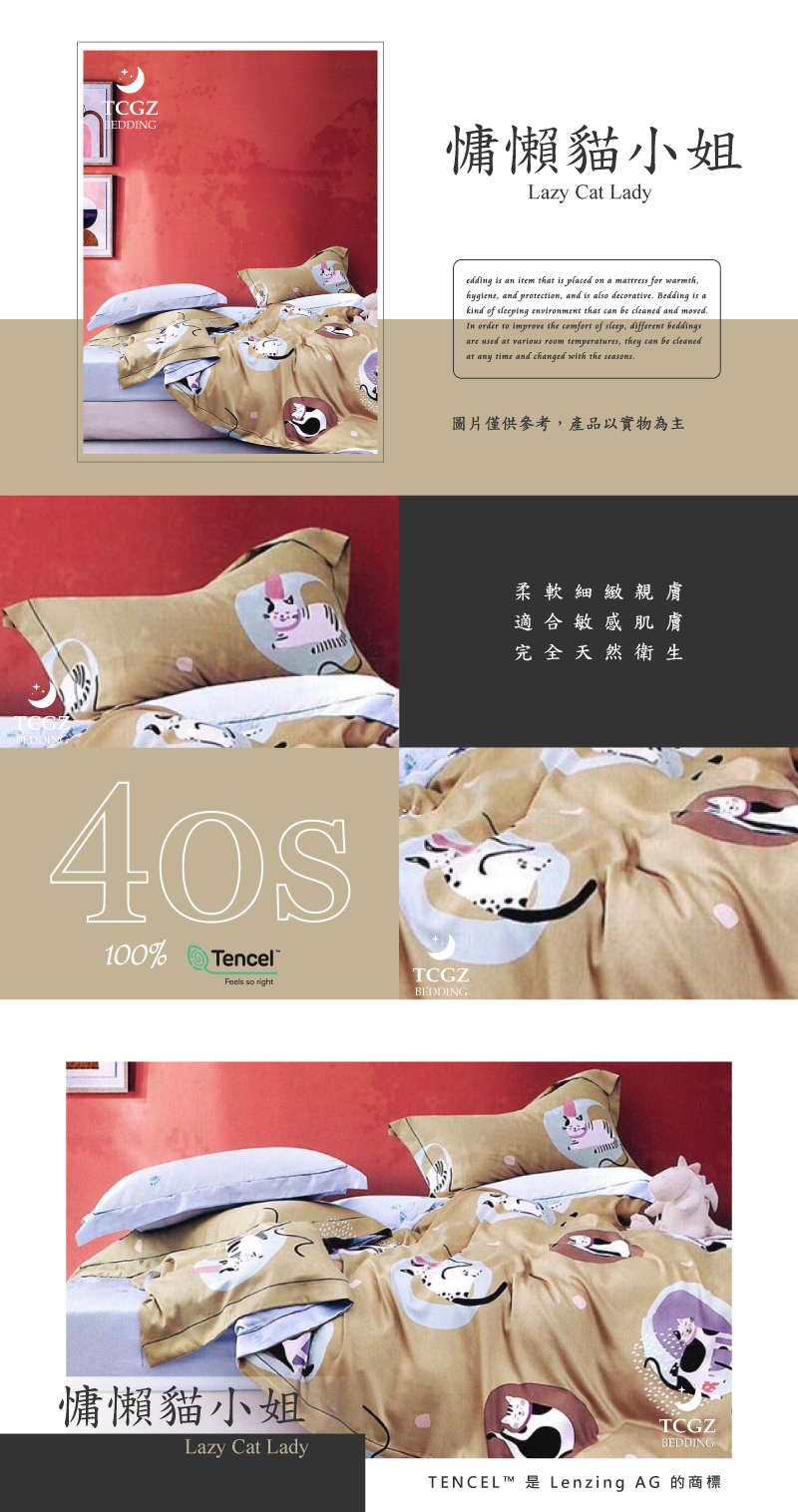 Tencel天絲™萊賽爾纖維製成的 100%40支 【慵懶貓小姐】 薄床包舖棉兩用被四件式組