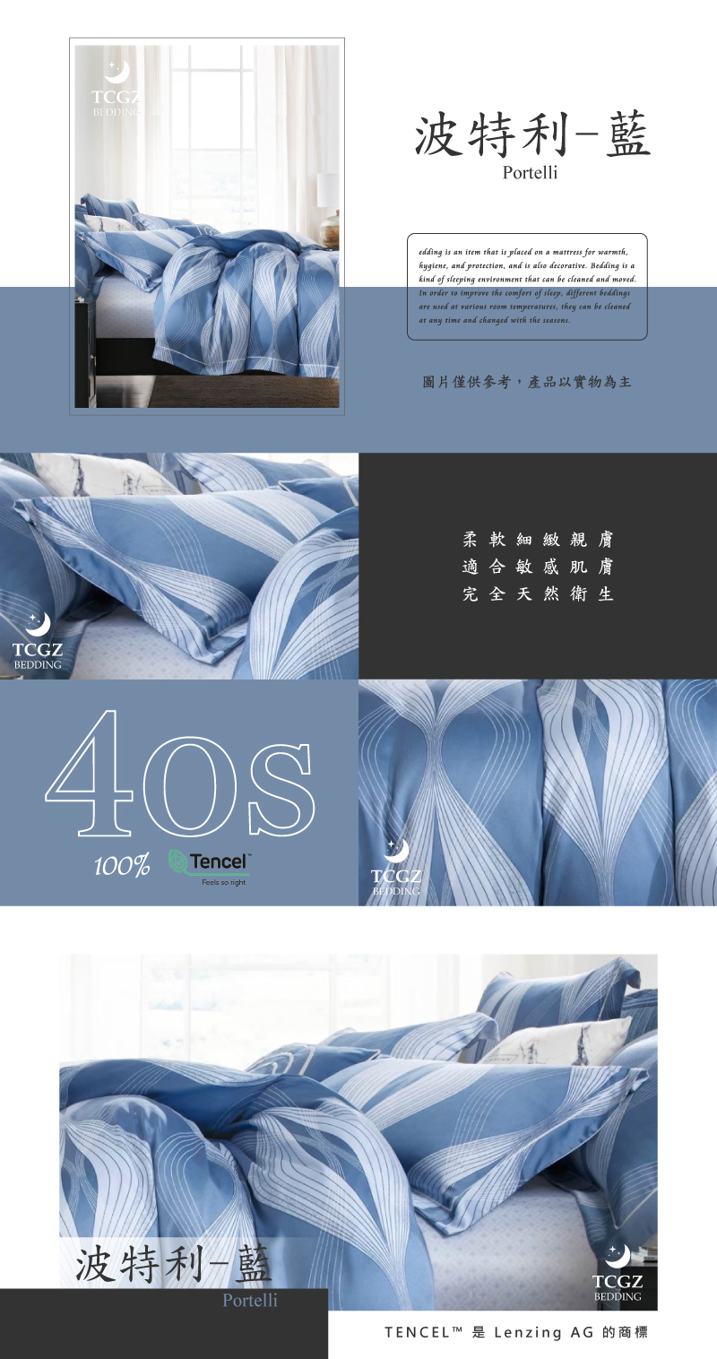 Tencel天絲™萊賽爾纖維製成的 100%40支 【波特利-藍】 薄床包舖棉兩用被四件式組