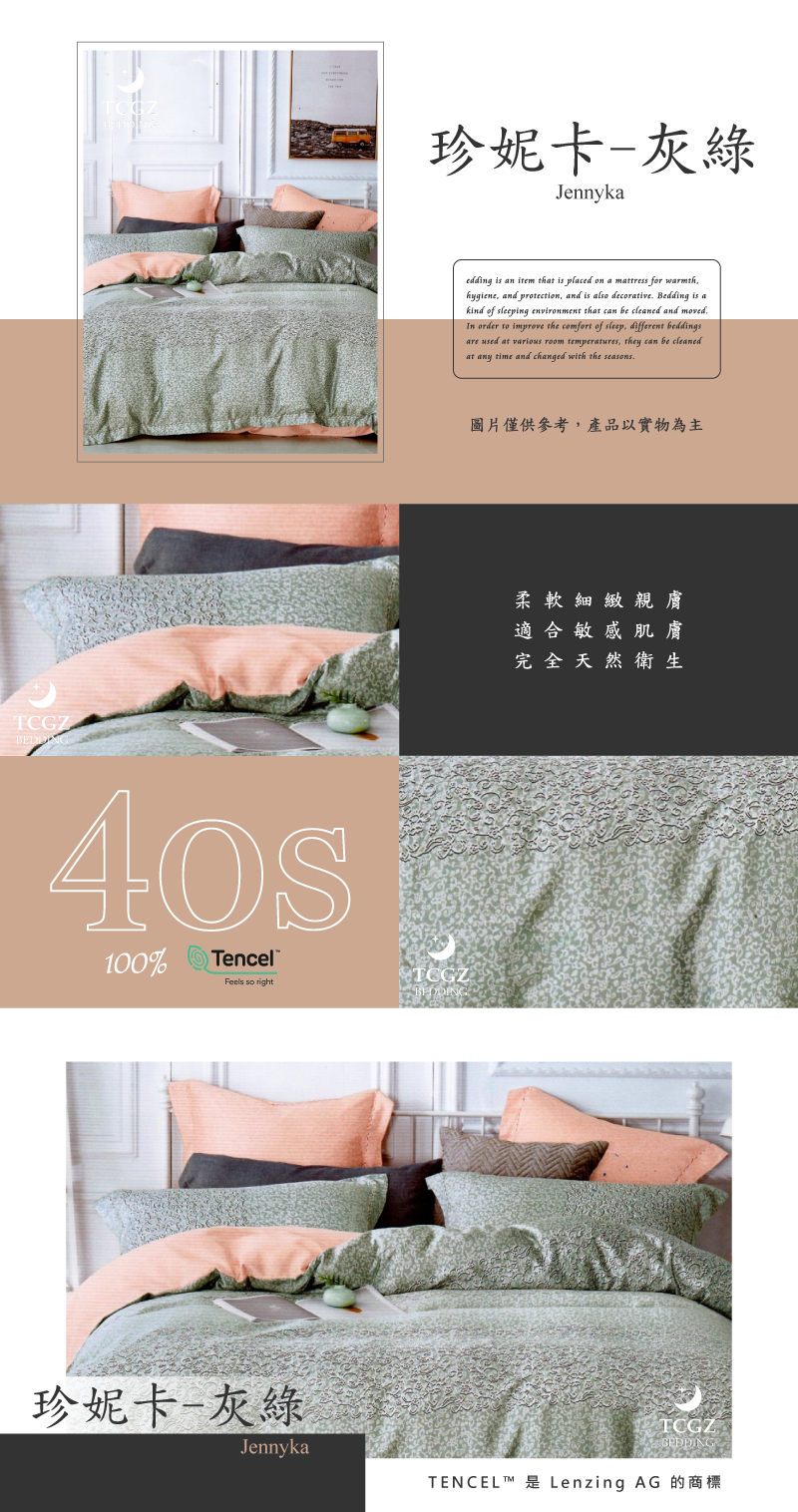 Tencel天絲™萊賽爾纖維製成的 100%40支 【珍妮卡-灰綠】 薄床包舖棉兩用被四件式組