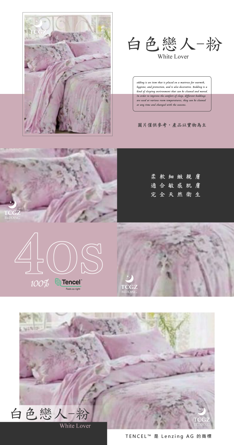 Tencel天絲™萊賽爾纖維製成的 100%40支 【白色戀人-粉】 薄床包舖棉兩用被四件式組