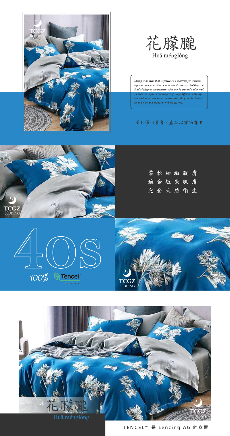 Tencel天絲™萊賽爾纖維製成的 100%40支 【花朦朧】 薄床包舖棉兩用被四件式組