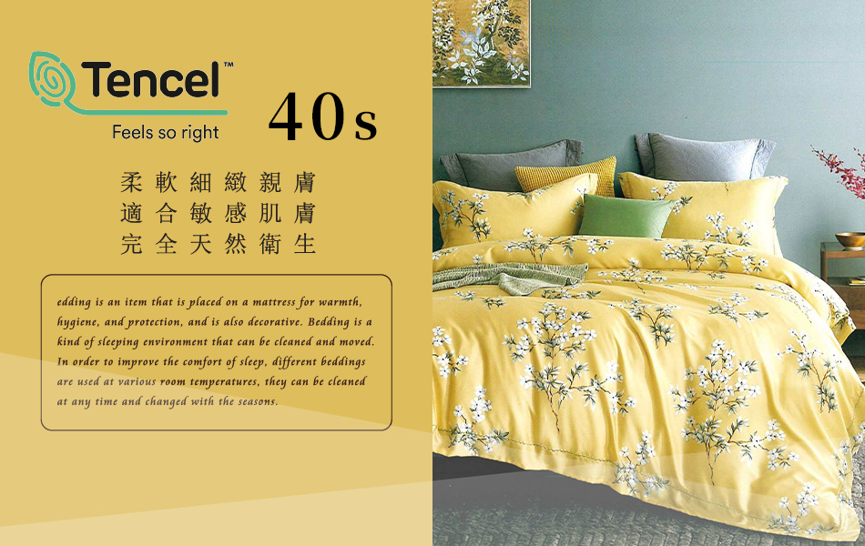 Tencel天絲™萊賽爾纖維製成的 100%40支 【花雨露-黃】 鋪棉床包舖棉兩用被四件式組-40aa