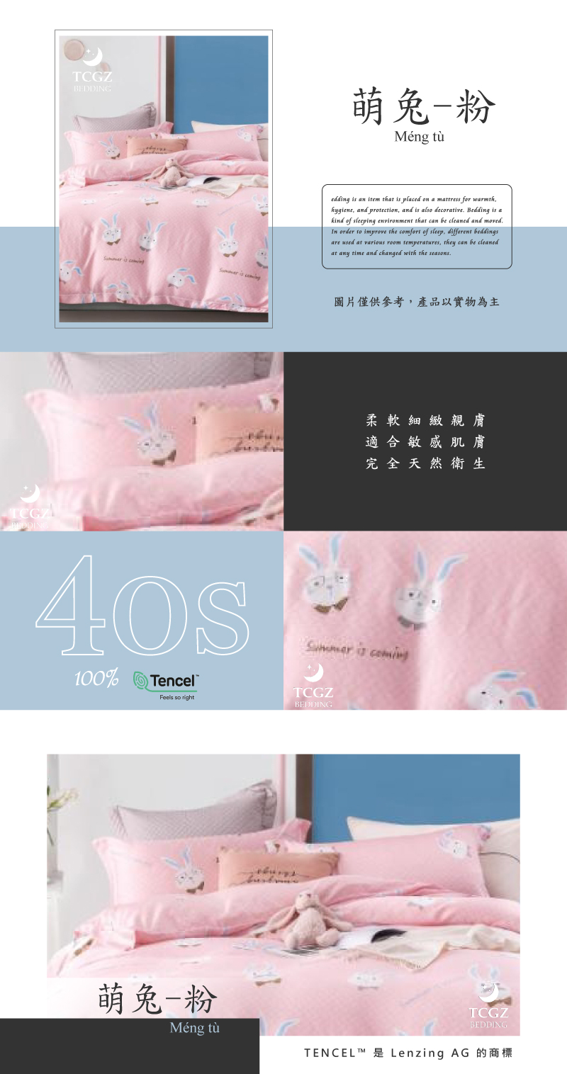 Tencel天絲™萊賽爾纖維製成的 100%40支 【萌兔-粉】 薄床包舖棉兩用被四件式組