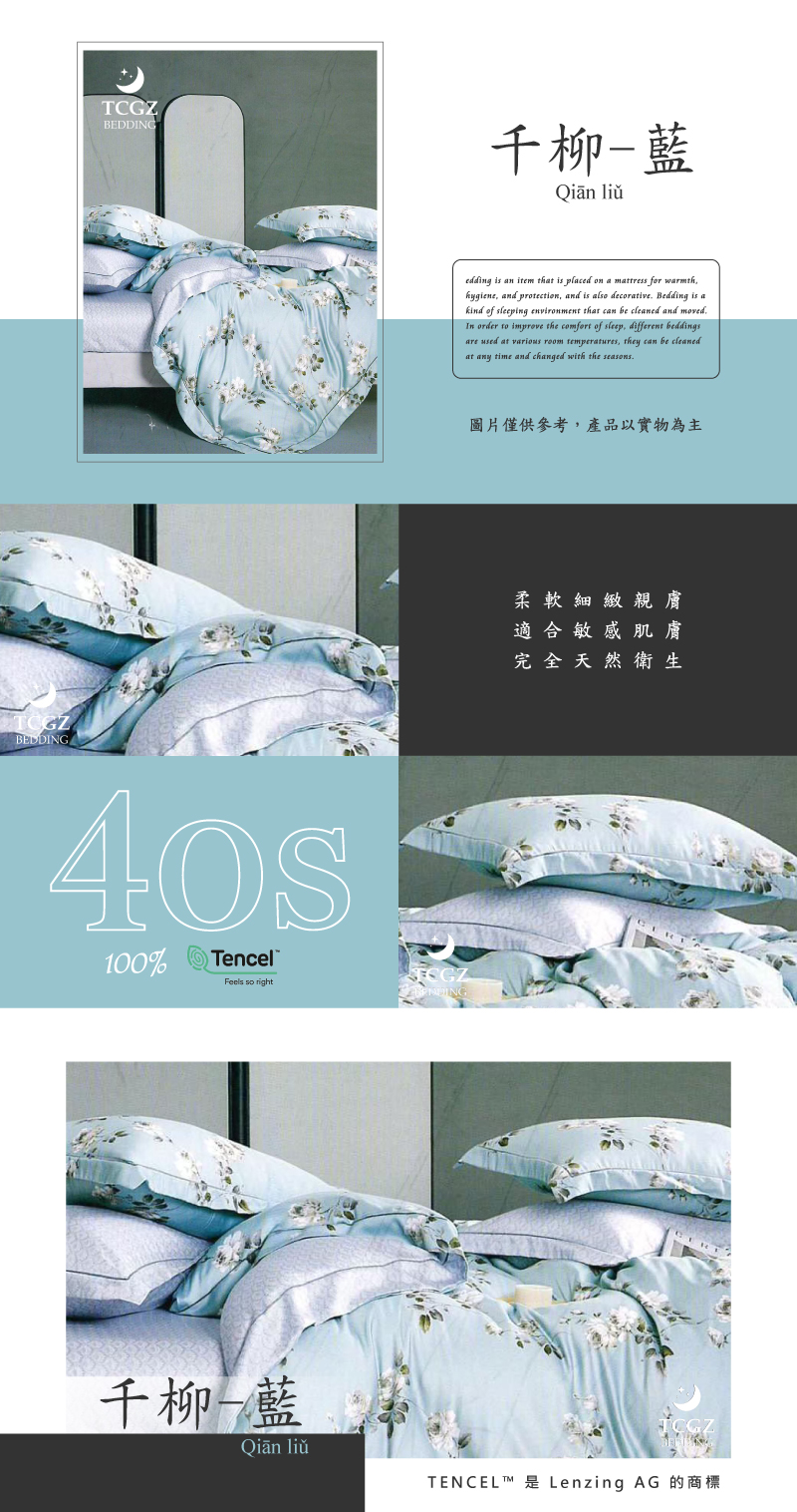 Tencel天絲™萊賽爾纖維製成的 100%40支 【千柳-藍】 薄床包舖棉兩用被四件式組
