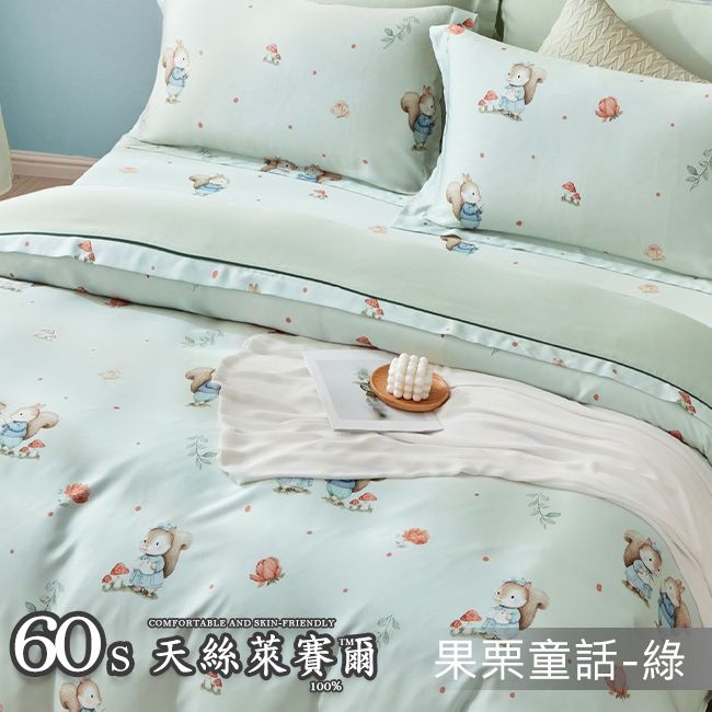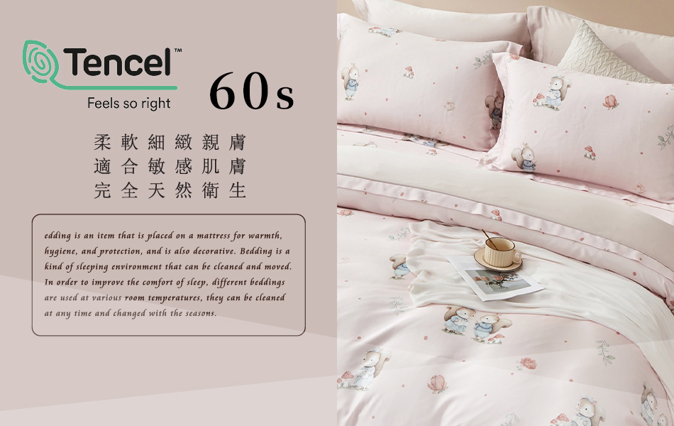 Tencel天絲™萊賽爾纖維製成的 100%60支 【果栗童話-粉】 薄床包舖棉兩用被四件式組-60ab
