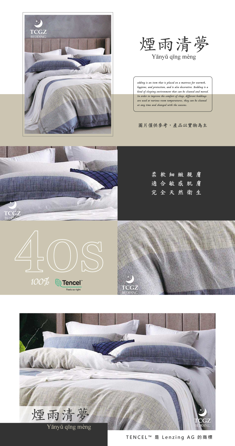 Tencel天絲™萊賽爾纖維製成的 100%40支 【煙雨清夢】 薄床包舖棉兩用被四件式組
