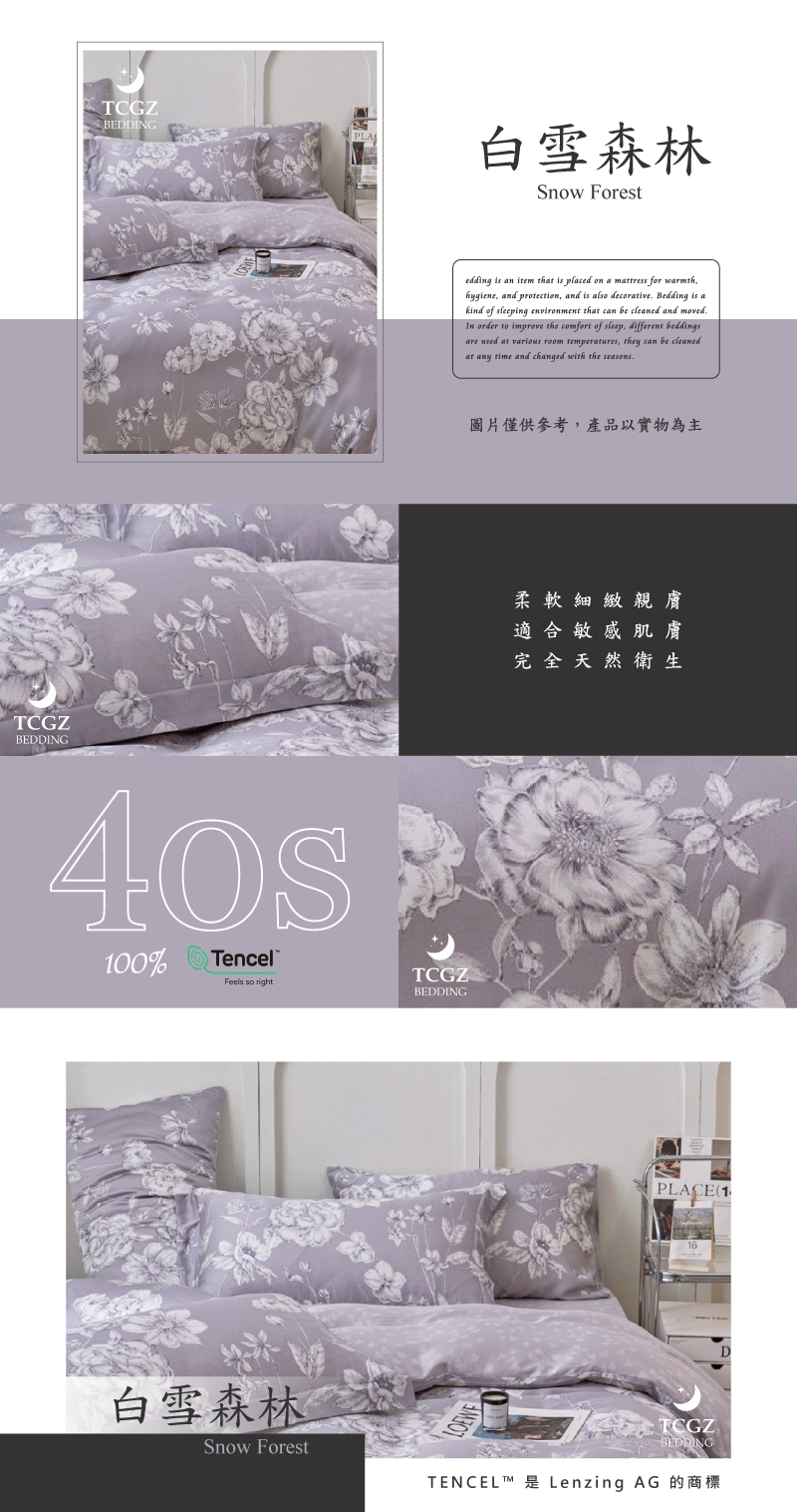 Tencel天絲™萊賽爾纖維製成的 100%40支 【白雪森林】 薄床包舖棉兩用被四件式組