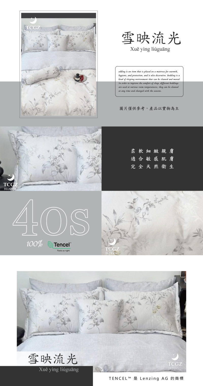 Tencel天絲™萊賽爾纖維製成的 100%40支 【雪映流光】 薄床包舖棉兩用被四件式組