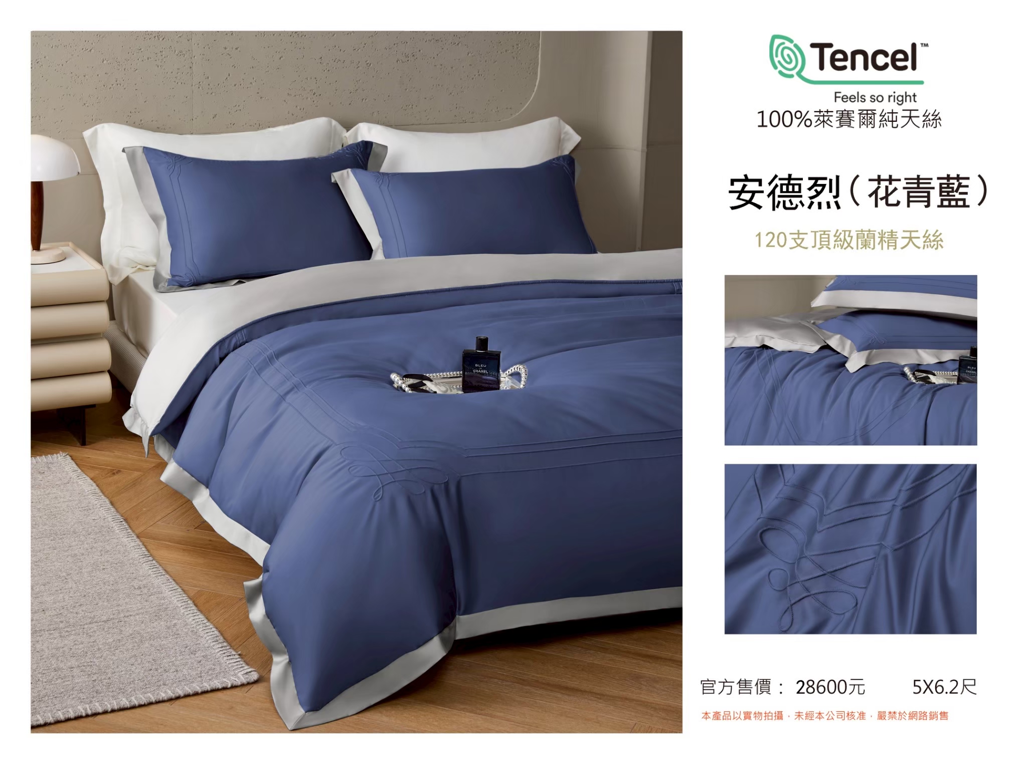 Tencel天絲™萊賽爾纖維製成的 100%120支 安德烈【花青藍】 薄床包舖棉兩用被四件式組