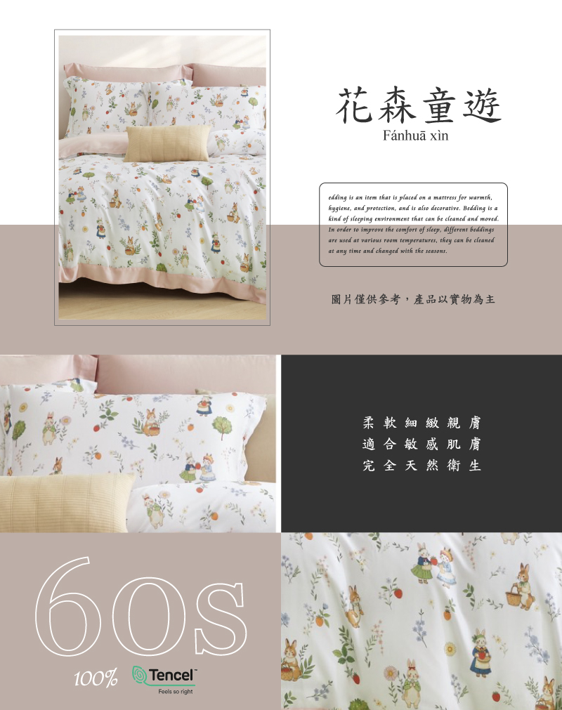 Tencel天絲™萊賽爾纖維製成 100%60支凡芮思【花森童遊】 薄床包舖棉兩用被四件式組